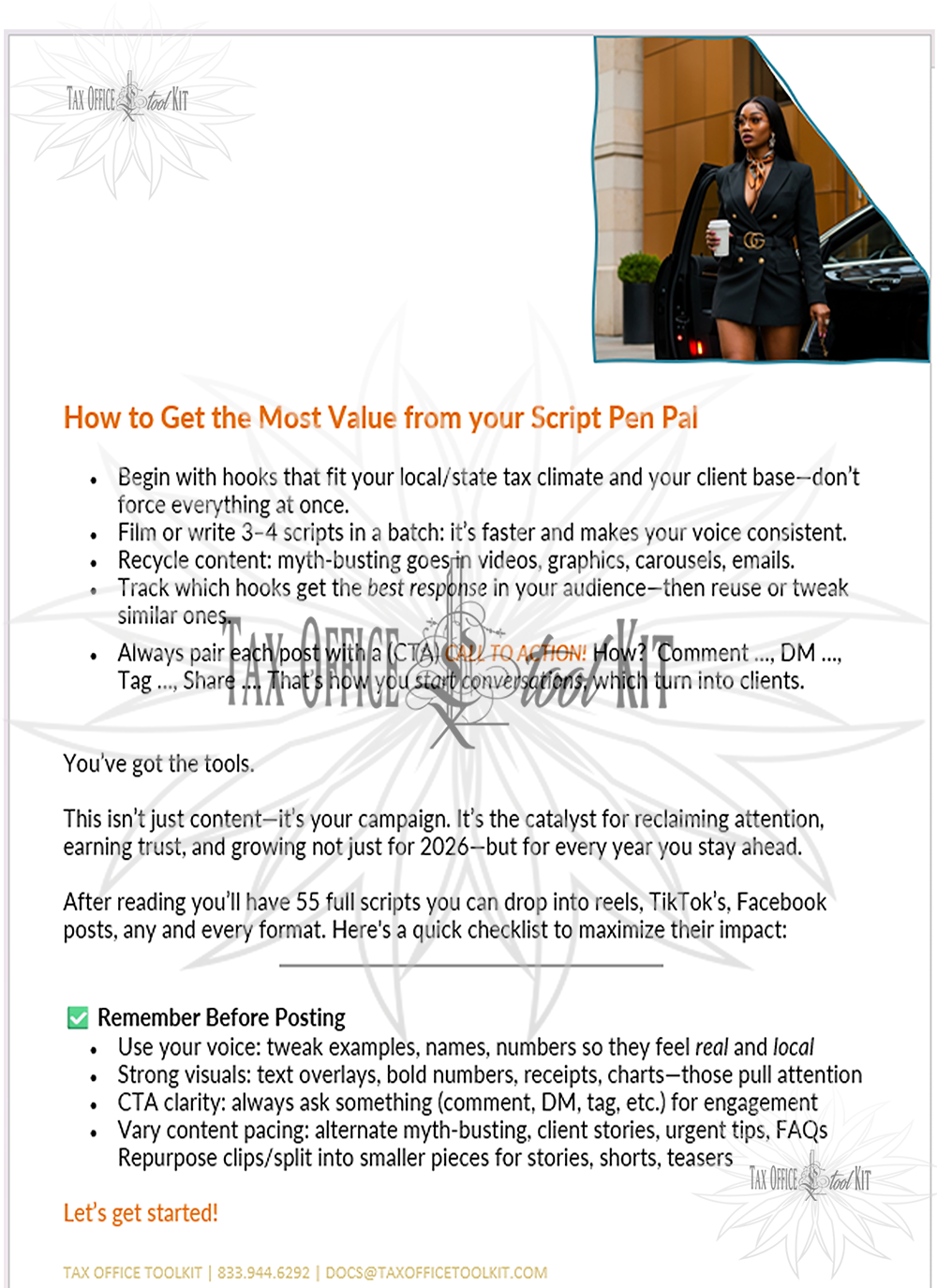 Transform your tax office marketing with Script PenPal—the ultimate collection of 50 done-for-you, high-impact content scripts for tax professionals. Written exclusively for CPAs, EAs, and tax preparers, each script features a proven hook, engaging opener, persuasive body, real-life value story, and a call-to-action that sparks DMs, comments, and appointments.